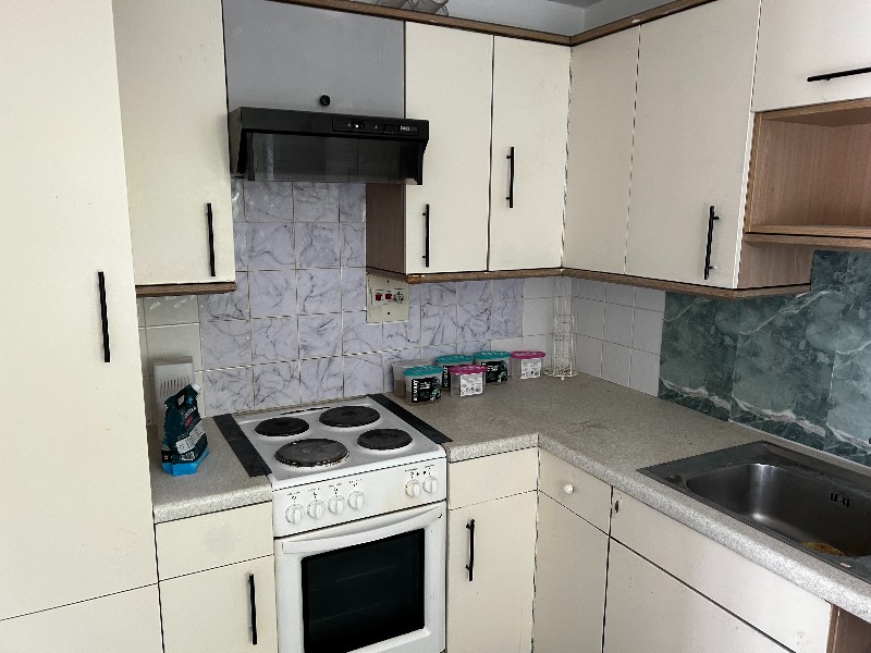 Having double glazed window, cream fronted kitchen units with speckled work surfaces, free standing electric cooker and hob and grey vinyl flooring.