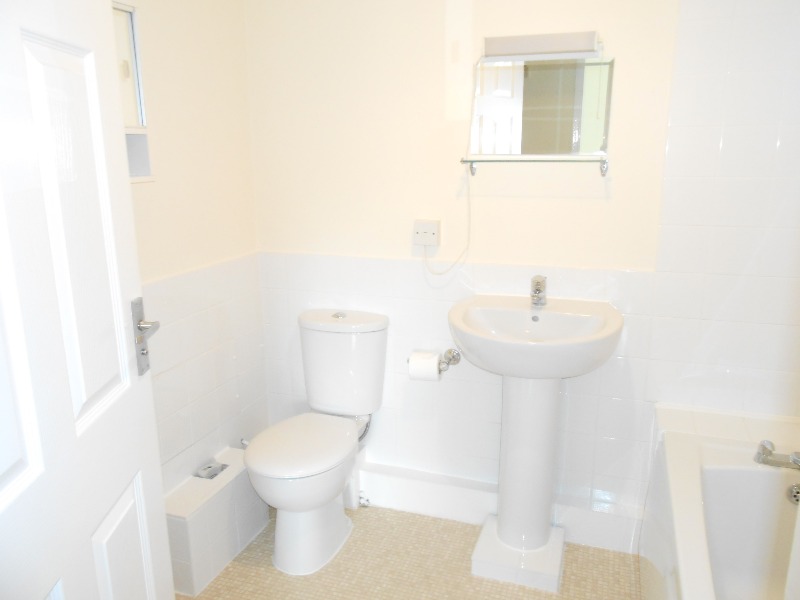 Having white bathroom suite with over bath shower, chrome towel radiator, extractor fan and grey vinyl flooring.