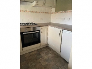 Having double glazed window, modern cream kitchen units with wood effect work surfaces, stainless steel sink and drainer, built in cooker and gas hob and tiled flooring.