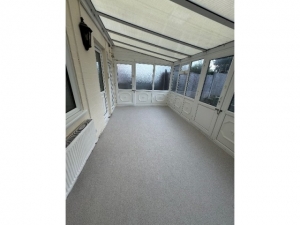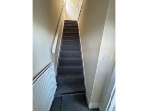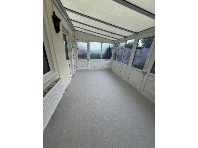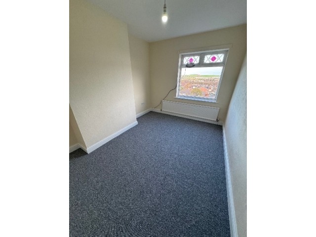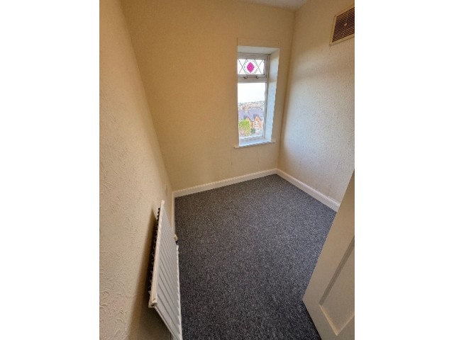 Having newly fitted modern white three piece bathroom suite with over bath shower, radiator, extractor fan and vinyl flooring.
