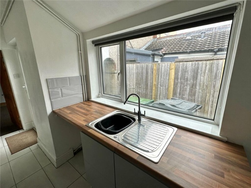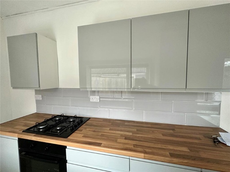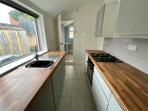 Having modern grey fitted kitchen with wooden work surfaces, stainless steel sink and drainer, double glazed window, upvc back entrance door and tiled flooring.
