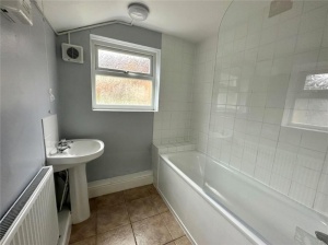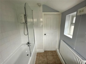 Having double glazed window, extractor fan, wall mounted radiator, white bath with over bath electric shower, toilet and tiled flooring.